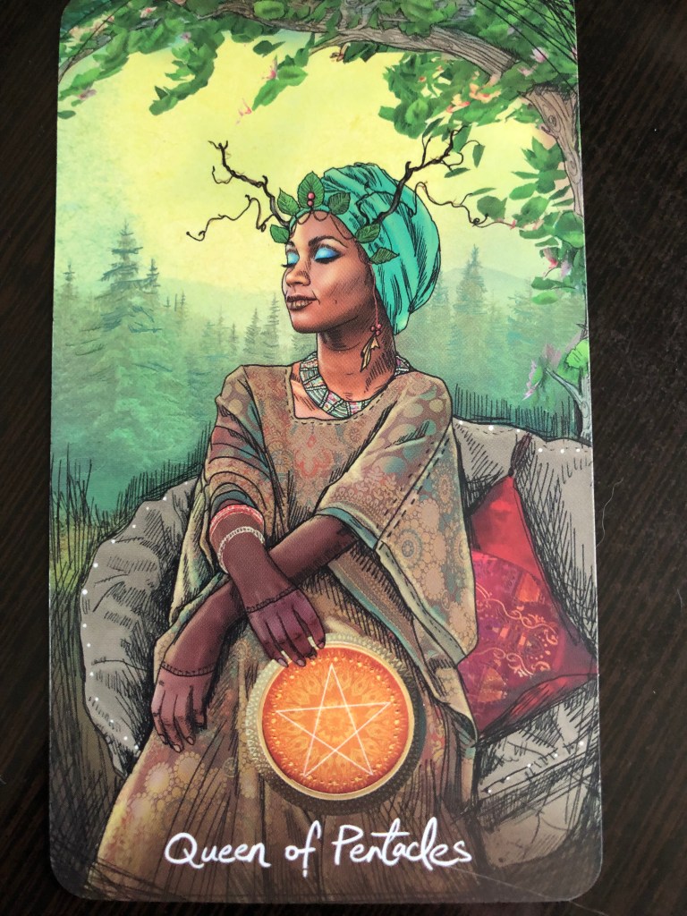 The Queen of Pentacles, for example, represents the sacred feminine of earth energy: nurturing, grounded, sustaining.