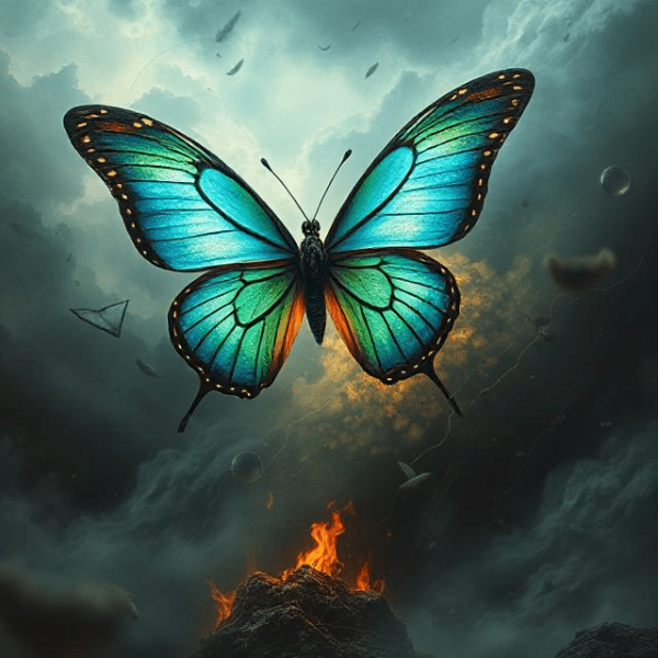 A fierce butterfly emerges from chaos, embodying power and transformation, shaking reality and the cosmos, and heralding liberation through its untamed presence and fiery wings.